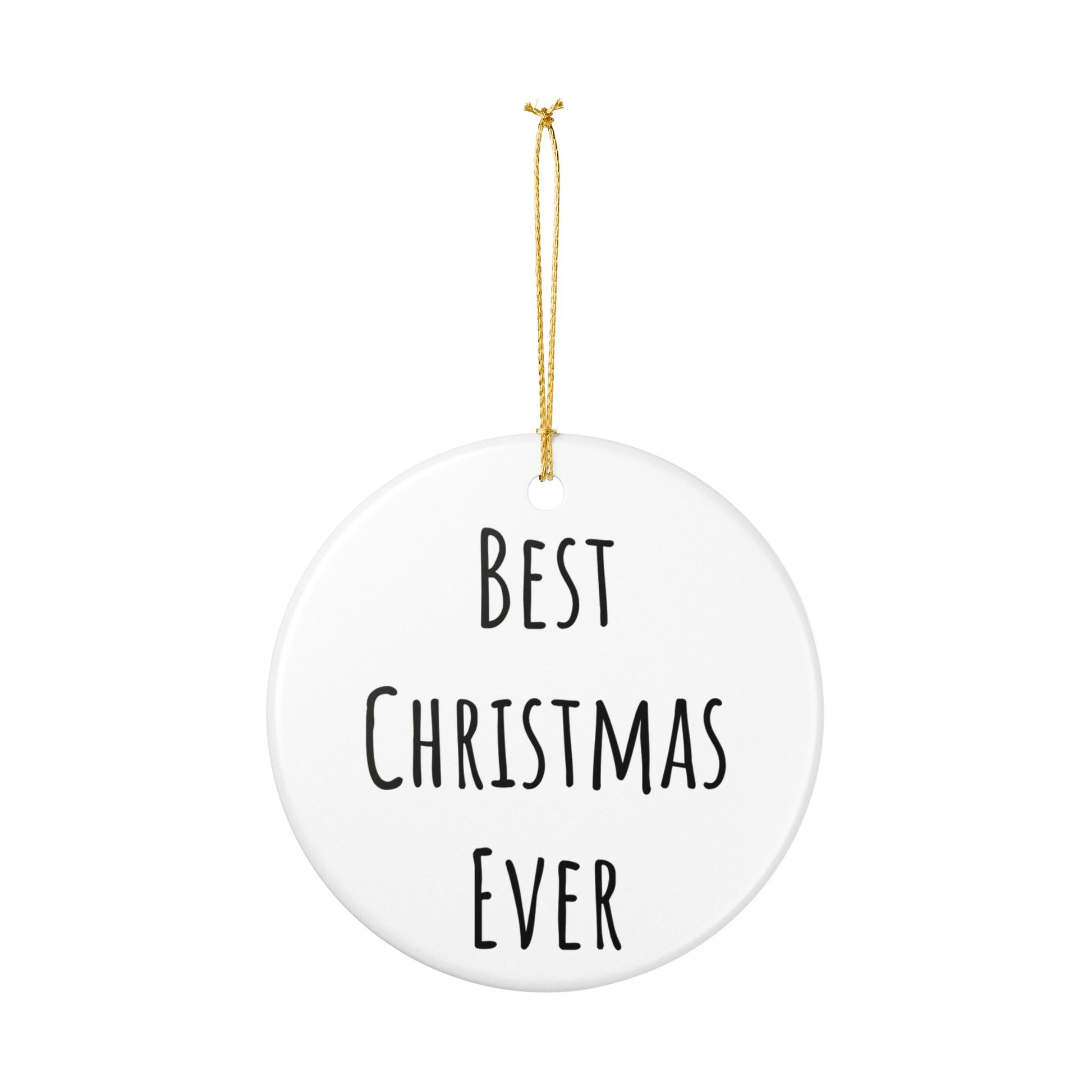 Best Christmas Ever Ceramic Ornament – Glossy White Disk with Matte Black Text, Gold Hanging String – Perfect for Holiday Decor and Gifts