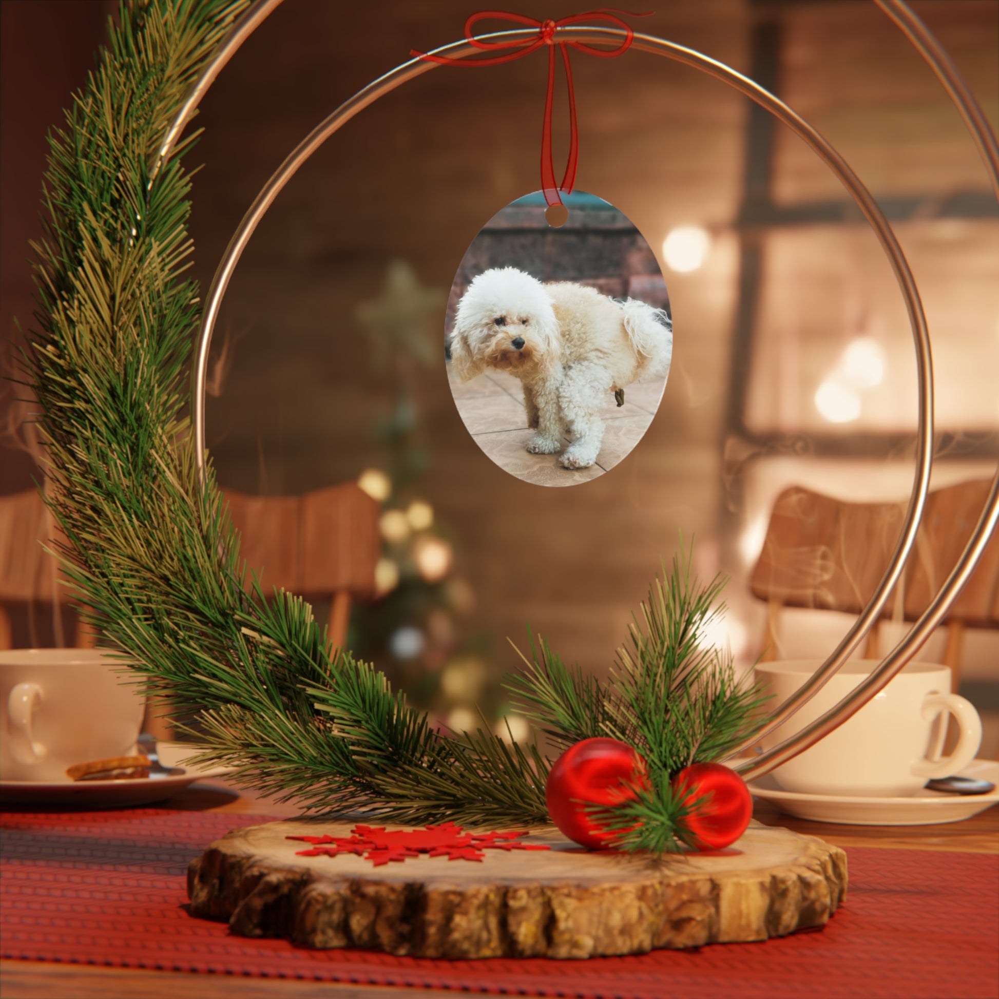 Crafted from durable glossy white aluminum, this ornament combines a polished, elegant look with the toughness to withstand years of holiday cheer. The red ribbon allows for easy hanging, whether on your Christmas tree, a mantle, or even in a pet-themed corner of your home. This unique piece captures a warm, familiar moment—the image is clear from every angle, thanks to its vibrant printing.