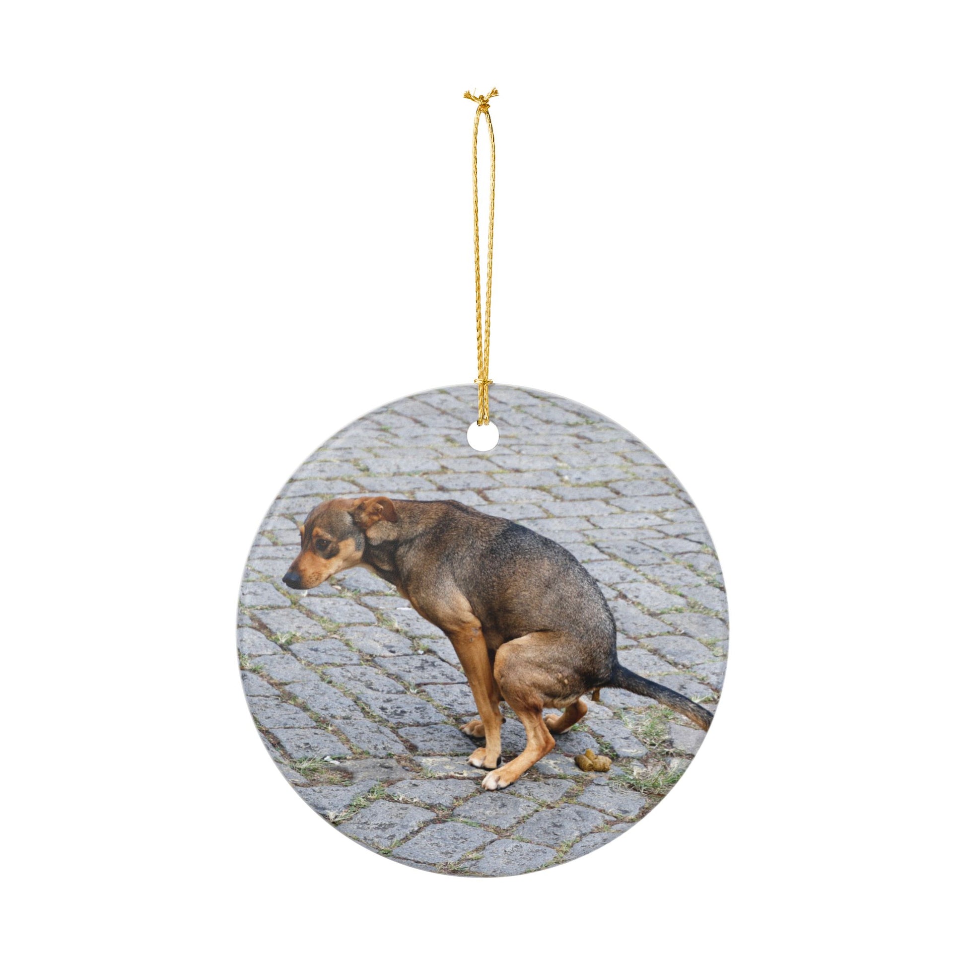 Add some humor and a touch of personality to your holiday decor with this Funny Pooping Dog Ceramic Ornament. Featuring a playful image of a dog caught in a natural moment, this ornament brings an unexpected and quirky element to your Christmas tree, window, or keepsake display. Made from 100% white ceramic, the 2.80" ornament offers long-lasting durability while the glossy surface contrasts beautifully with the matte printed image. The UV-protected finish ensures that the image stays vibrant, making it a lasting reminder of life’s small, humorous moments.