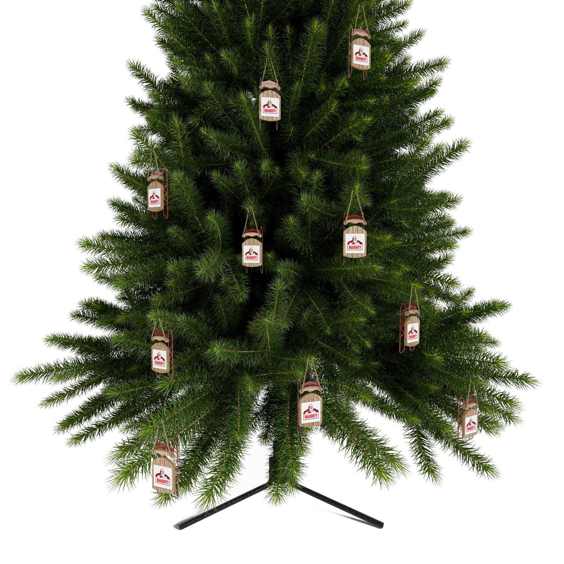 The ornament features a vibrant image of Santa pointing to a bold red “NAUGHTY” sign, printed with crisp detail to stand out beautifully against the natural wooden finish. Its charming sled design adds texture and warmth to your tree, wreath, or mantel display, making it a standout piece among classic ornaments.
